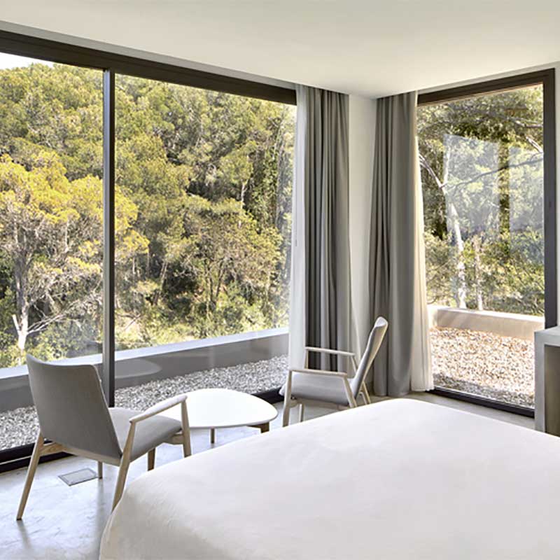 Интегралната технологија на свиткување на шупливата алуминиумска шипка, комбинирана со бутил гума со мала стапка на пренос на водена пареа и двокомпонентна неутрална силиконска гума, обезбедува големи шупливи простори и ефикасна звучна изолација. Дизајнот на вградената рамна рамка на листот од вратата нуди поширок приказ без да биде наметлив.